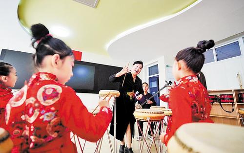 4月12日,“中国好人”、乐亭大鼓第七代传人赵蕊(左二)在乐亭市鼓韵书苑给孩子们讲授乐亭大鼓的演唱技巧。