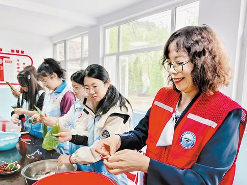 5月31日,“中国好人”陈文廷(右一)走进张家口市桥西区四岔村,参加端午节包粽子主题活动,教青少年包粽子。