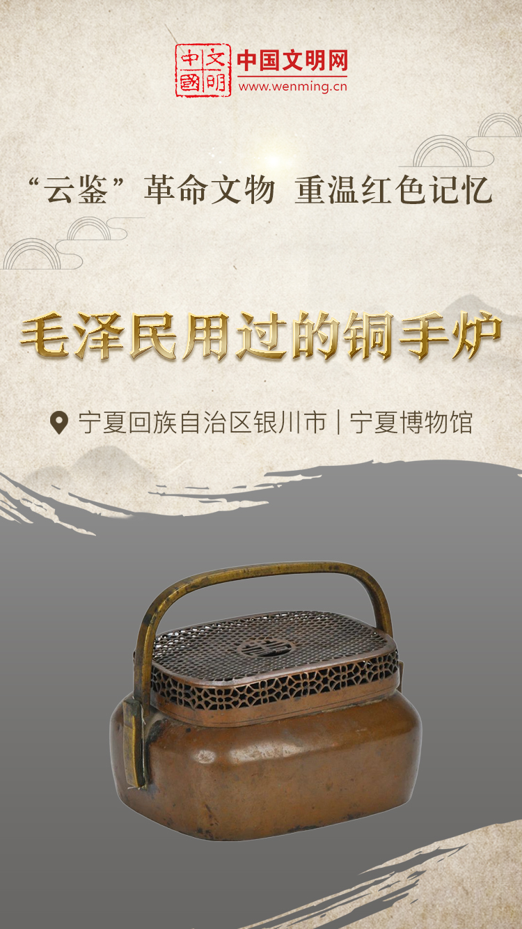 革命文物,承载党和人民英勇奋斗的光荣历史,是弘扬革命传统和革命文化、加强社会主义精神文明建设、激发爱国热情、振奋民族精神的生动教材。中国文明网“文明之声·云鉴馆藏”专栏邀您走进各地革命博物馆、纪念馆、党史馆等红色主题场馆,一起“打卡”红色地标,“云鉴”红色馆藏,汲取奋进力量。今天为您介绍宁夏博物馆的馆藏文物——毛泽民用过的铜手炉。